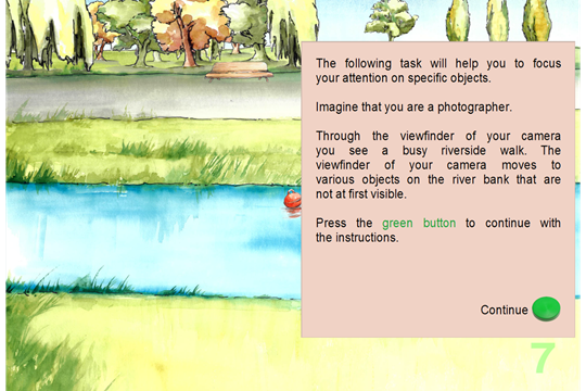 Az ügyfél a fotós szerepét ölti magára. Feladata különféle helyszínek megfigyelése, például piac, repülőtér, iroda, játszótér stb. A kamera keresője a megfigyelt terület egy adott pontja felé mozog. A feladat az, hogy a reakciógomb megnyomásával „fotót” készítsünk, amint a kereső megáll, és „elfogott” egy tárgyat. Minden jelenet közepén van egy rögzítési pont, amely felé a kliensnek kell irányítania a fej helyzetét és a tekintetének irányát, és ahol megtalálhatja a keresőt, ha elvesztette a fókuszt.